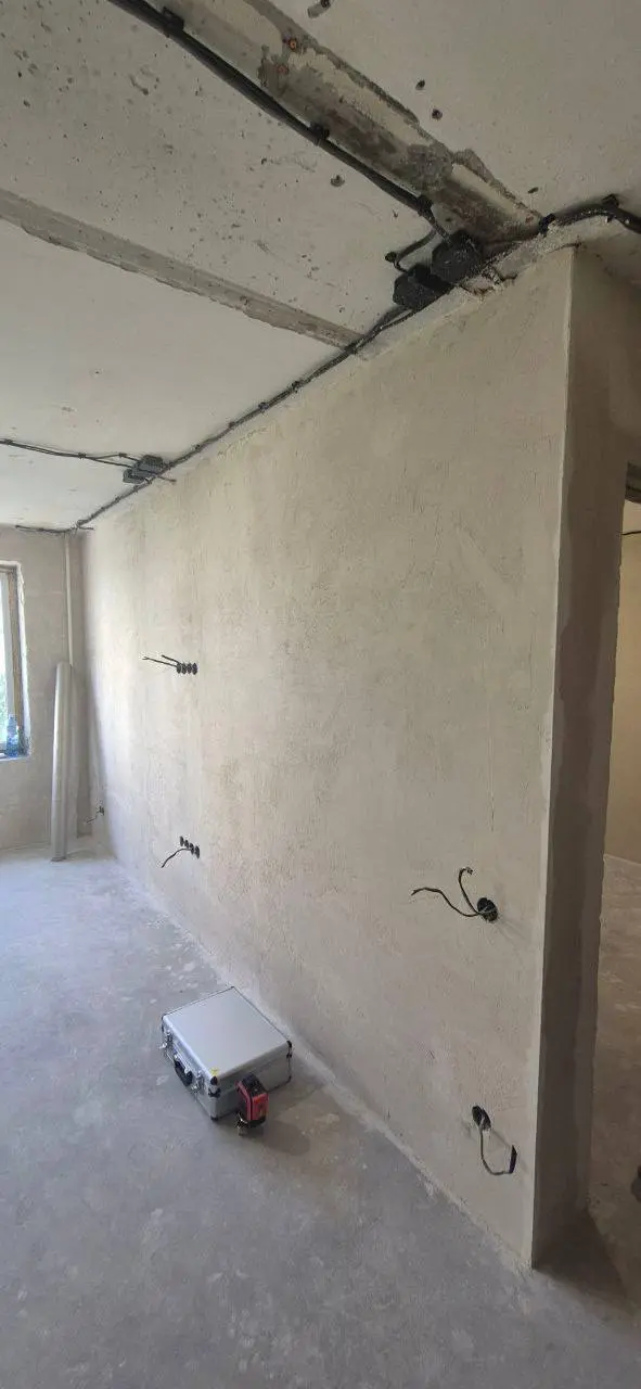 Снимаем старые обои, штукатурку, плитку, стяжку — всё, что мешает новой отделке. Убираем непрочные слои, чтобы новая штукатурка держалась крепко. Вывозим строительный мусор до контейнера. Демонтаж — это грязная работа, но без неё не обойтись, если стены в плохом состоянии. Лучше один раз сделать правильно, чем потом переделывать, когда штукатурка отвалится вместе с обоями. Так вы экономите на повторном ремонте.