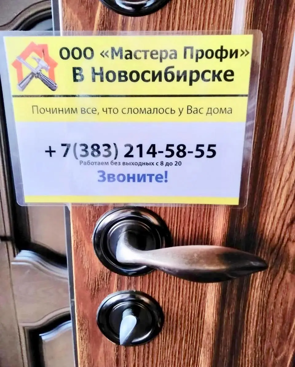 С 2007 года мы официально работаем в Новосибирске, предлагая качественный и честный сервис. Мы специализируемся на решении бытовых проблем, включая срочный ремонт дверных ручек входных и металлических дверей. Все работы выполняются по договору с точной сметой. Наши мастера — специалисты с опытом от 10 лет, которые приезжают в фирменной одежде, с полным набором инструмента и убирают за собой мусор. Качество лично контролирует учредитель Михаил Горбатов, а на сложные вопросы всегда готов ответить директор Андрей Евлампиев.